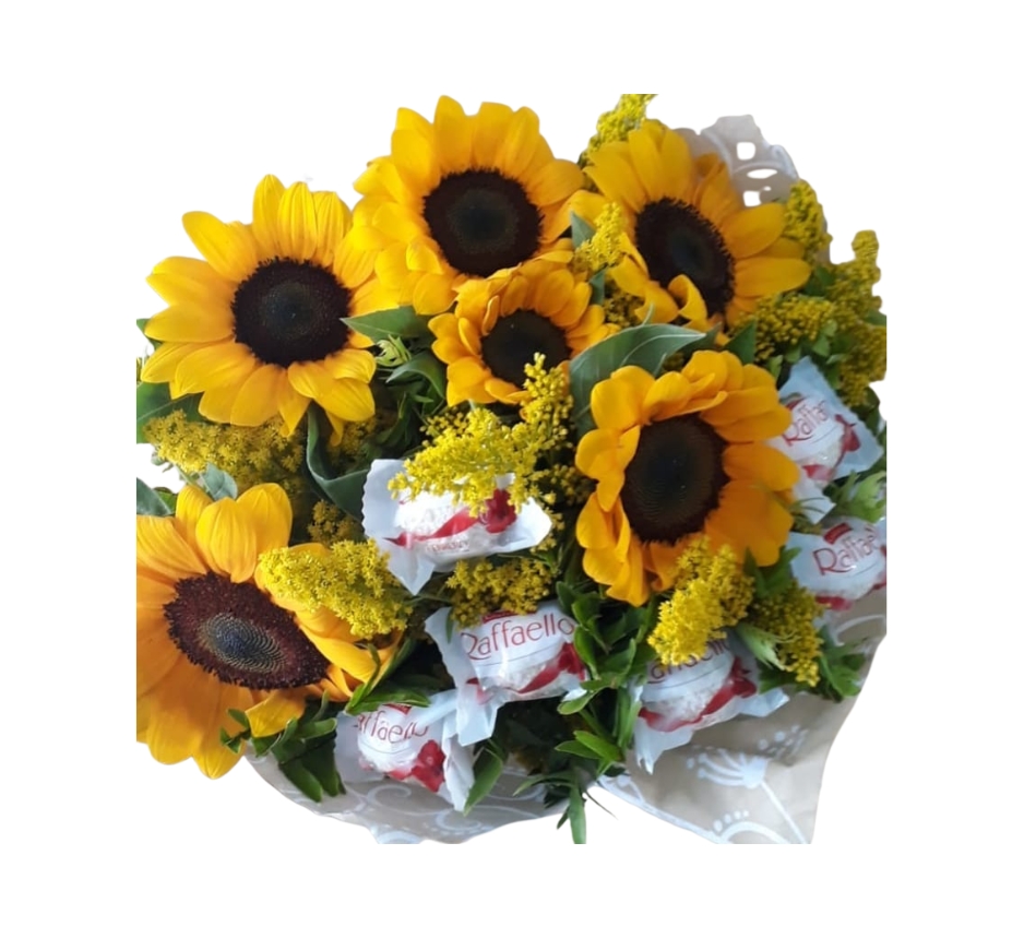 E para tornar o presente ainda mais especial, este buquê é personalizado com chocolates Rafaello, que se encontram cuidadosamente entre as flores. Os chocolates Rafaello são uma combinação divina de coco e amêndoa, proporcionando um toque de indulgência que harmoniza maravilhosamente com a vivacidade dos girassóis. É o presente ideal para celebrar momentos doces da vida