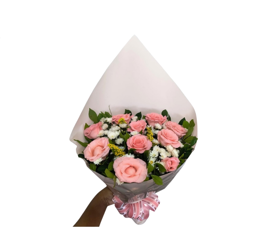 Delicadeza e charme em sua forma mais romântica. Este buquê traz 9 rosas na suave cor rosa, símbolo de amor doce, ternura e gratidão, harmonizadas com a leveza das avencas, a maciez do carinho de mãe e o brilho alegre do tango amarelo.