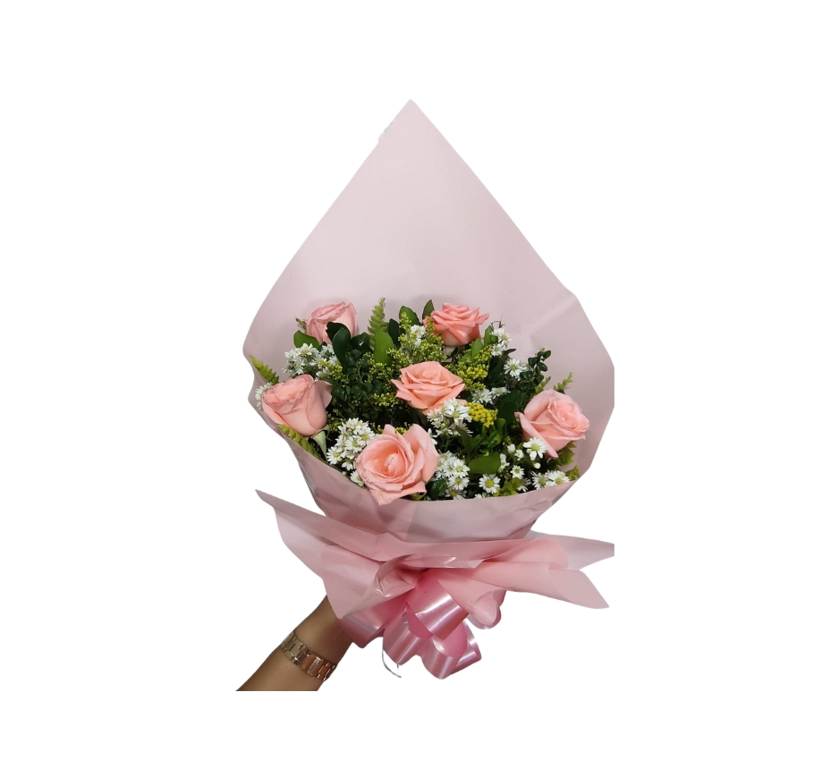 Demonstre carinho e ternura com 6 rosas cor de rosa, perfeitas para transmitir amor, admiração e gratidão. Combinadas com o frescor dos jasmins verdes, o brilho do tango amarelo e a suavidade do carinho de mãe branco, este arranjo é pura delicadeza.