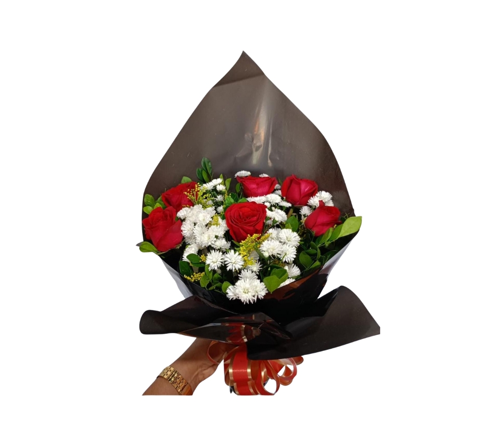 Um buquê elegante, romântico e marcante. O Buquê Neo Master black traz a intensidade de 6 rosas vermelhas, símbolo eterno de paixão e amor verdadeiro, em harmonia com a delicadeza do tango amarelo, a suavidade do jasmim verde e o charme da áster mariana branca.