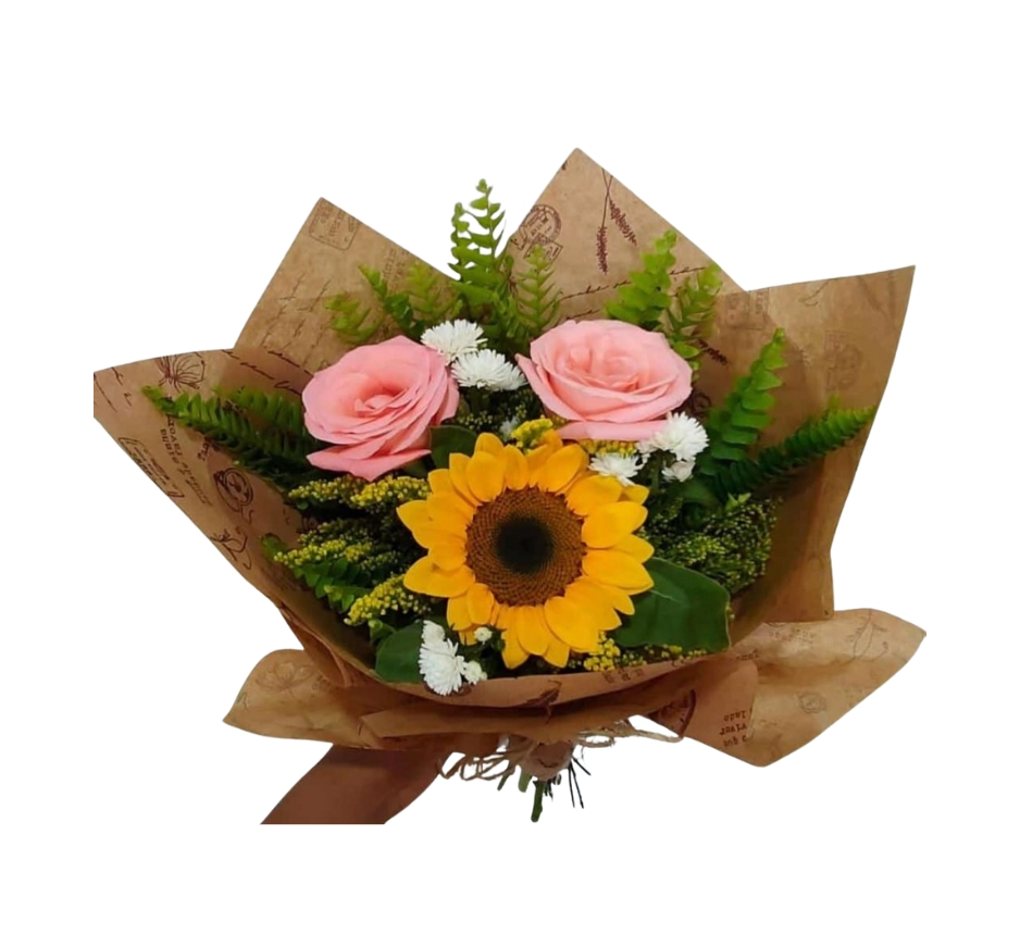 Um presente que transmite alegria e delicadeza em cada detalhe. O Buquê Encanto Solar reúne a força luminosa de um girassol com a suavidade romântica de duas rosas cor de rosa, criando uma combinação doce e inesquecível.