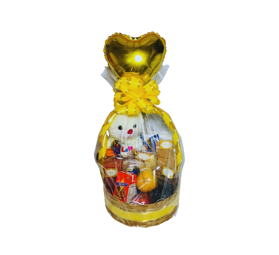 Bebidas: Suco, achocolatado e iogurte Panificação: Pães de forma, bolachas caseira mimosa, torrada, salgado de forno fofinho, bolo (rocambole ou tradicional), queijo muçarela e presunto Frutas: Maçã, pera e mamão (ou uva), Adicionais: Biscoito recheado, bombons e cookies. Decoração: Cesta de vime com alças decoradas, bordas decoradas, embrulho decorativo, fundo decorativo, laco e palha decorativa